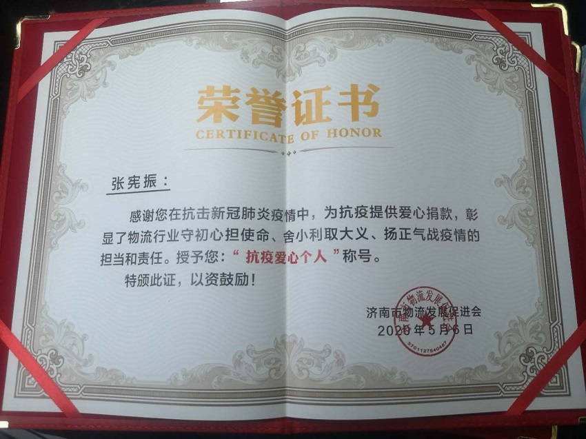 經(jīng)評選,振宇物流榮獲“抗疫先進(jìn)單位”,總經(jīng)理張憲振榮獲“抗疫愛心個(gè)人”!