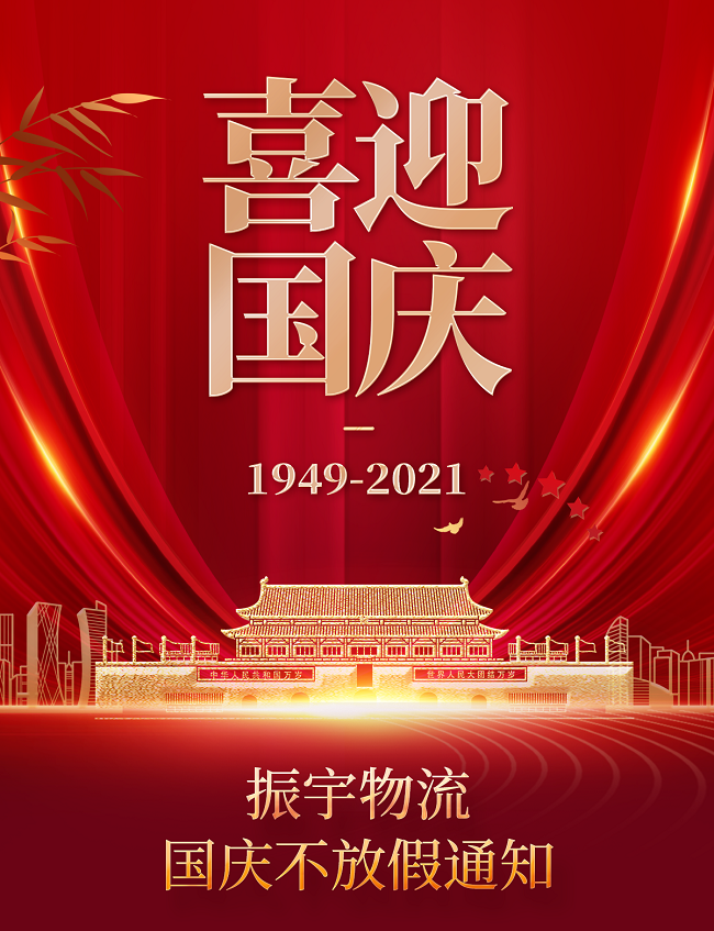 您好!正值秋高氣爽天,恰逢稻熟豐登日,祖國母親即將迎來72周年華誕。五星紅旗迎風(fēng)飄揚,我們同慶祖國華誕的榮光!振宇物流為了給您提供更好的服務(wù),并結(jié)合我司實際情況,現(xiàn)對國慶假日期間做出如下工作安排: