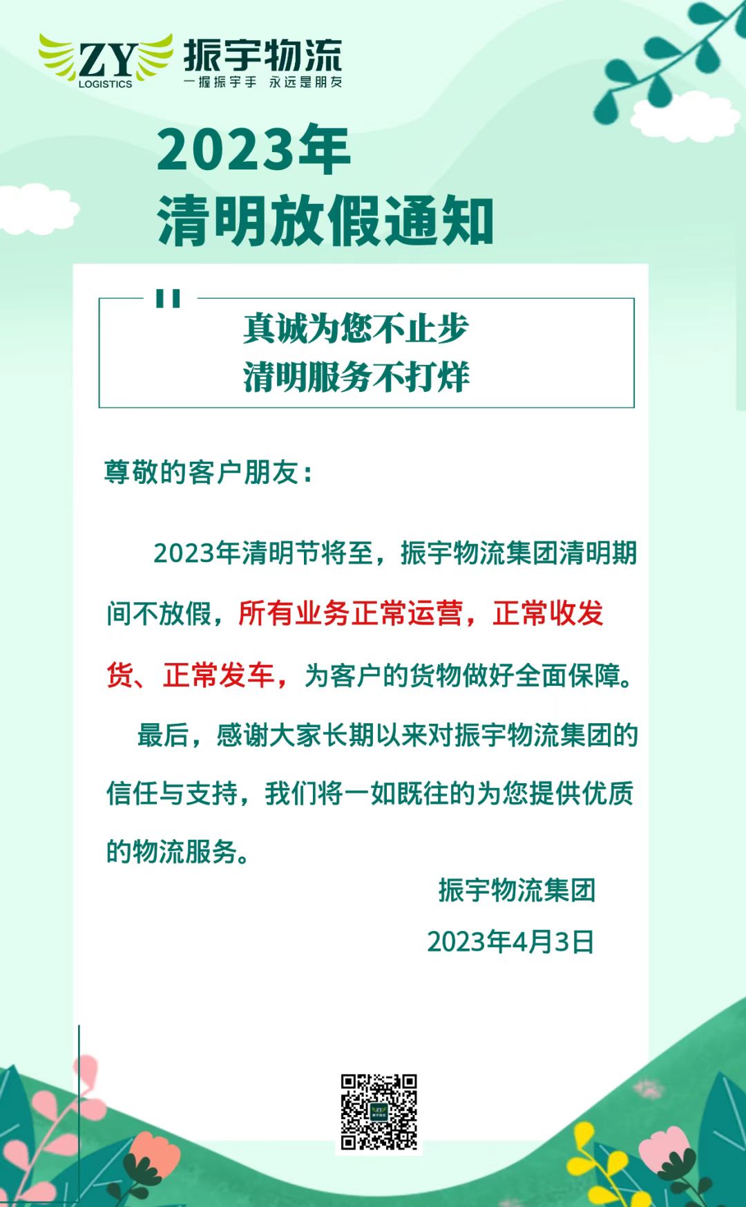 2023年清明節(jié)將至,振宇物流集團(tuán)清明期間不放假,所有業(yè)務(wù)正常運(yùn)營(yíng),正常收發(fā)貨、正常發(fā)車,為客戶的貨物做好全面保障。最后,感謝大家長(zhǎng)期以來對(duì)振宇物流集團(tuán)的信任與支持,在此祝您度過一個(gè)愉快的假期。