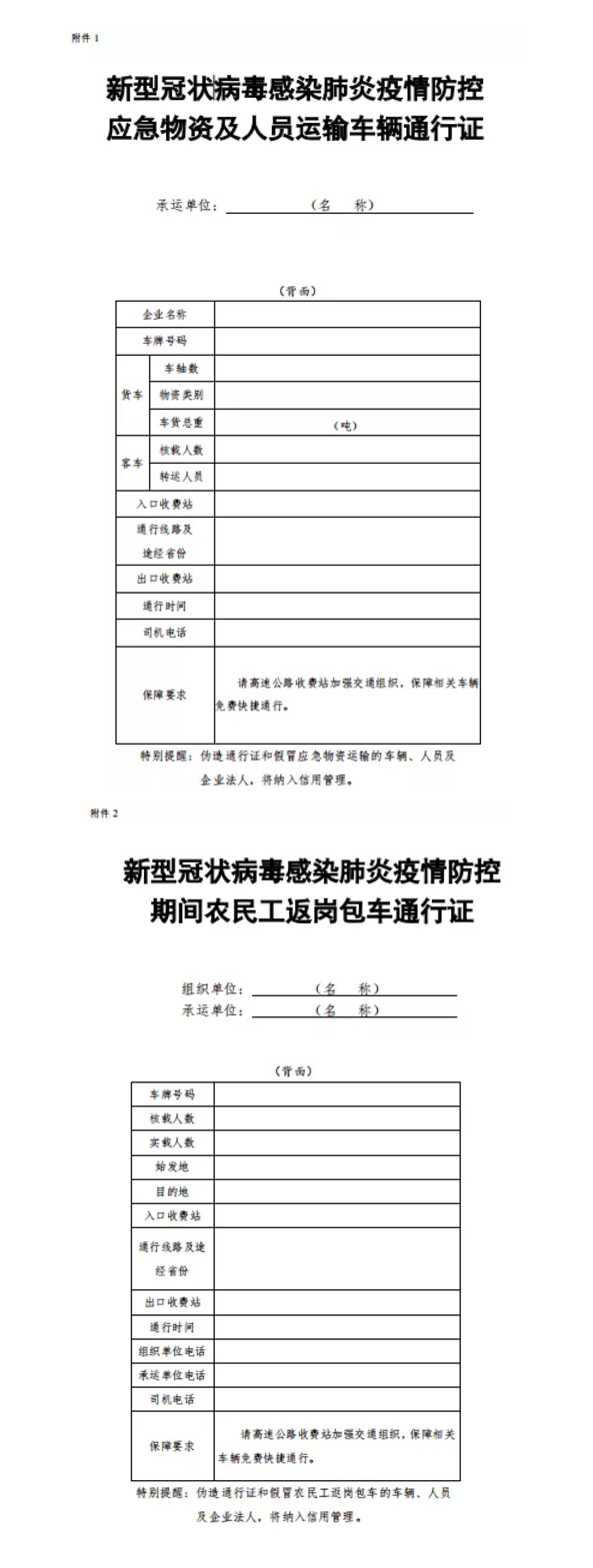 通知要求,地方各級(jí)交通運(yùn)輸部門要認(rèn)真落實(shí)《交通運(yùn)輸部關(guān)于切實(shí)保障疫情防控應(yīng)急物資運(yùn)輸車輛順暢通行的緊急通知》和《交通運(yùn)輸部關(guān)于疫情防控期間免收農(nóng)民工返崗包車公路通行費(fèi)的通知》要求,切實(shí)簡(jiǎn)化“新型冠狀病毒感染肺炎疫情防控應(yīng)急物資及人員運(yùn)輸車輛通行證”(簡(jiǎn)稱“車輛通行證”)、“新型冠狀病毒感染肺炎疫情防控期間農(nóng)民工返崗包車通行證”(簡(jiǎn)稱“包車通行證”)辦理流程,通過(guò)政府網(wǎng)站、微信、電子郵件等便捷方式提供“車輛通行證”“包車通行證”統(tǒng)一式樣,供承運(yùn)單位或駕駛?cè)嗽诒镜刈孕写蛴?、自行填寫?/span>