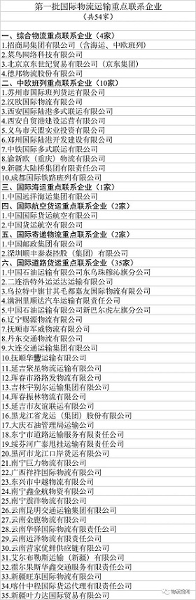 按照運力資源充足、網(wǎng)絡(luò)覆蓋健全、運輸組織高效、經(jīng)營信譽良好的原則,經(jīng)各有關(guān)部門及沿邊省份交通運輸主管部門推薦,確定54家企業(yè)作為第一批國際物流運輸重點聯(lián)系企業(yè),其中,綜合物流企業(yè)4家、中歐班列運營企業(yè)10家、國際航運企業(yè)1家、國際航空貨運企業(yè)2家、國際寄遞物流企業(yè)2家、國際道路運輸企業(yè)35家。包括招商局集團(tuán)、菜鳥網(wǎng)絡(luò)、京東集團(tuán)、德邦股份、中遠(yuǎn)海運、中國郵政集團(tuán)、順豐、國貨航等企業(yè)入圍。