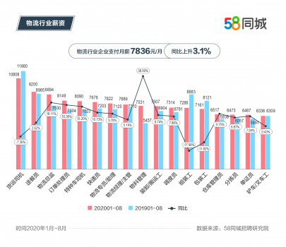 薪酬水平也是物流行業(yè)就業(yè)的重要指標(biāo),58同城招聘研究院數(shù)據(jù)顯示,今年1-8月,交通運(yùn)輸、倉(cāng)儲(chǔ)和郵政業(yè)支付月薪達(dá)到7836元,同比上升3.1%。典型職位中,貨運(yùn)司機(jī)支付月薪第一,達(dá)到10808元;送餐員支付月薪排名第二,為9200元;物料管理支付月薪同比上升最快,增幅38%,月薪達(dá)到7531元。可見(jiàn),物流行業(yè)崗位薪資與崗位技術(shù)含量、市場(chǎng)需求、勞動(dòng)強(qiáng)度密切相關(guān),技術(shù)含量高、市場(chǎng)需求大、勞動(dòng)強(qiáng)度大的崗位收入更高。