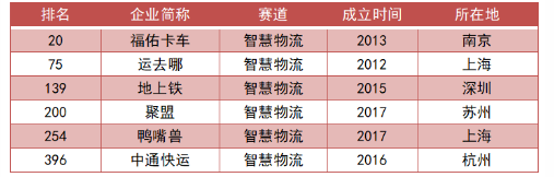 另外,排名前100的企業(yè)有第20位的福佑卡車和第75位的運去哪。福佑卡車作為技術(shù)驅(qū)動型公路貨運平臺,近日已赴美遞交IPO申請,計劃在納斯達克上市。而一站式國際物流在線服務(wù)平臺于前日宣布獲得中信資本領(lǐng)投,襄禾資本和老股東跟投的新一輪融資,D1輪累計融資額達1.5億美元,總?cè)谫Y金額超過了3億美元。