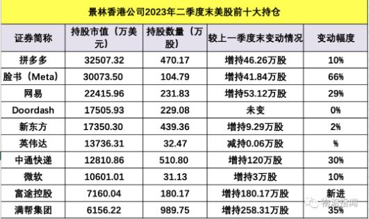 根據(jù)13F文件,截至6月30日,景林資產(chǎn)在美股持有28只證券,合計持倉市值達到20.69億美元(約合人民幣149.76億元),環(huán)比增幅約20%。具體來看,二季度末其美股前十大重倉股分別是拼多多、臉書母公司Meta、網(wǎng)易、Doordash、新東方、英偉達、中通快遞、微軟、富途控股、滿幫集團,中概股依舊占主導。
