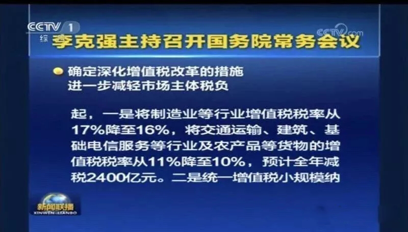 會(huì)議指出,過去五年通過實(shí)施營改增累計(jì)減稅2.1萬億元。按照黨中央、國務(wù)院部署,為進(jìn)一步完善稅制,支持制造業(yè)、小微企業(yè)等實(shí)體經(jīng)濟(jì)發(fā)展,持續(xù)為市場(chǎng)主體減負(fù),會(huì)議決定,從2018年5月1日起,一是將制造業(yè)等行業(yè)增值稅稅率從17%降至16%,將交通運(yùn)輸、建筑、基礎(chǔ)電信服務(wù)等行業(yè)及農(nóng)產(chǎn)品等貨物的增值稅稅率從11%降至10%,預(yù)計(jì)全年可減稅2400億元。