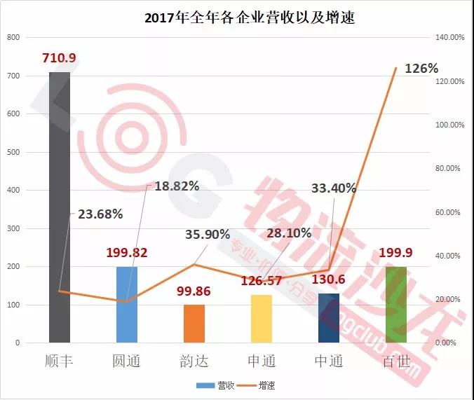 我們可以從營收增速來看看各家企業(yè)表現(xiàn)力。具體來看,百世第一,增幅高達(dá)126%,其次是韻達(dá)、中通、申通,分別是35.9%、33.4%、28.1%,都高于郵政局公布的2017年全年快遞收入增長速度(2017年行業(yè)增速為24.7%)。