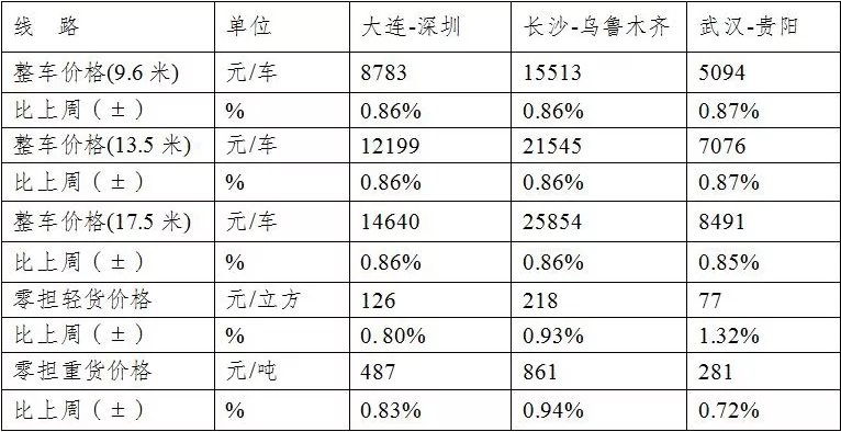 各車(chē)型指數(shù)均有不同程度回升,本周整車(chē)指數(shù)為967.4點(diǎn),比上周回升0.93%;零擔(dān)重貨指數(shù)為965.6點(diǎn),比上周回升0.87%;零擔(dān)輕貨指數(shù)為1014.64點(diǎn),比上周回升0.78%。