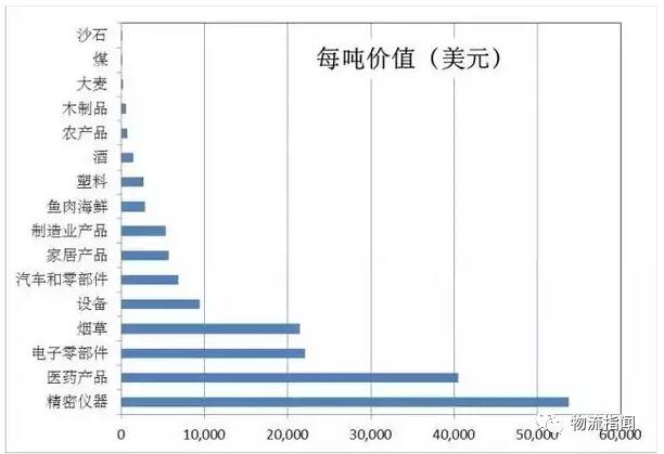 其次是經(jīng)濟(jì)水平?jīng)Q定的貨物價(jià)值。同樣一公斤貨,因?yàn)閱喂镓浳飪r(jià)值的不同會(huì)對(duì)GDP產(chǎn)生很大影響。例如下圖是美國(guó)不同類(lèi)別的貨物平均每噸的價(jià)值,可以看到差別非常大,一噸煤和一噸煙草價(jià)值可以相差100倍。同樣一噸貨物,價(jià)值更高對(duì)應(yīng)的GDP就更高。